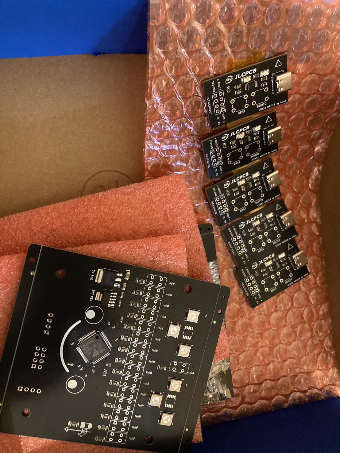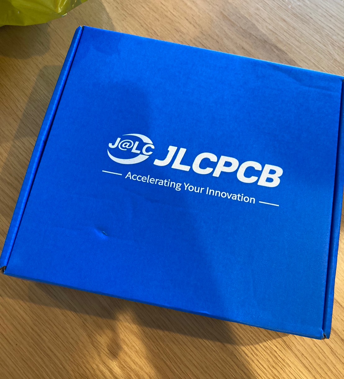 今までより少し大きな箱で届きました。今回も発注からちょうど一週間で届きました。JLCPCBは届くのが早くてありがたいです。