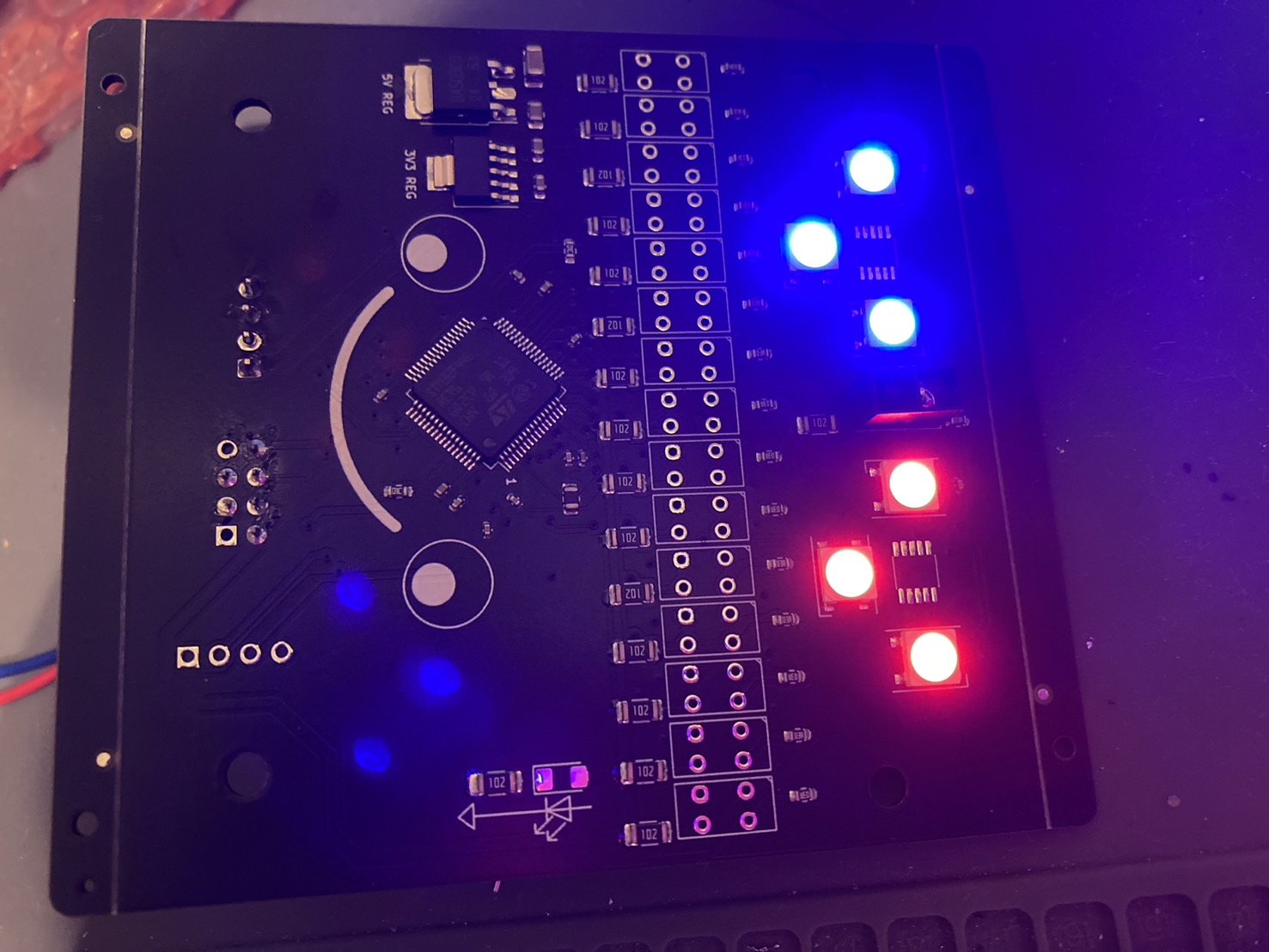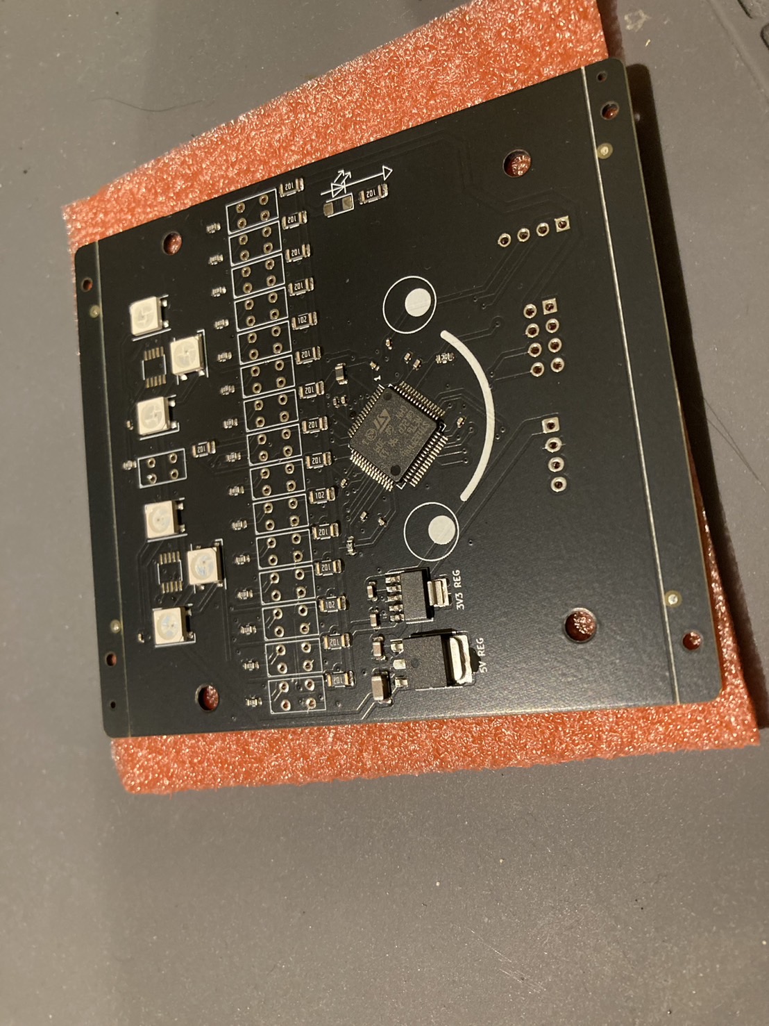 カラーセンサがI2Cなので基板の外に出したくなかったのと、フォトリフレクタの数が多いのでSTM32F446を一つのせています。