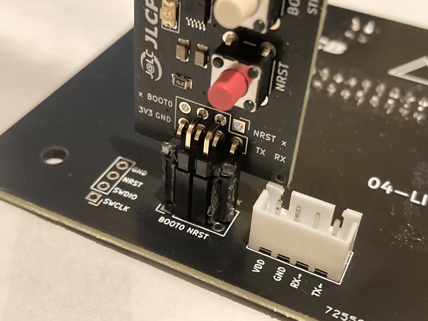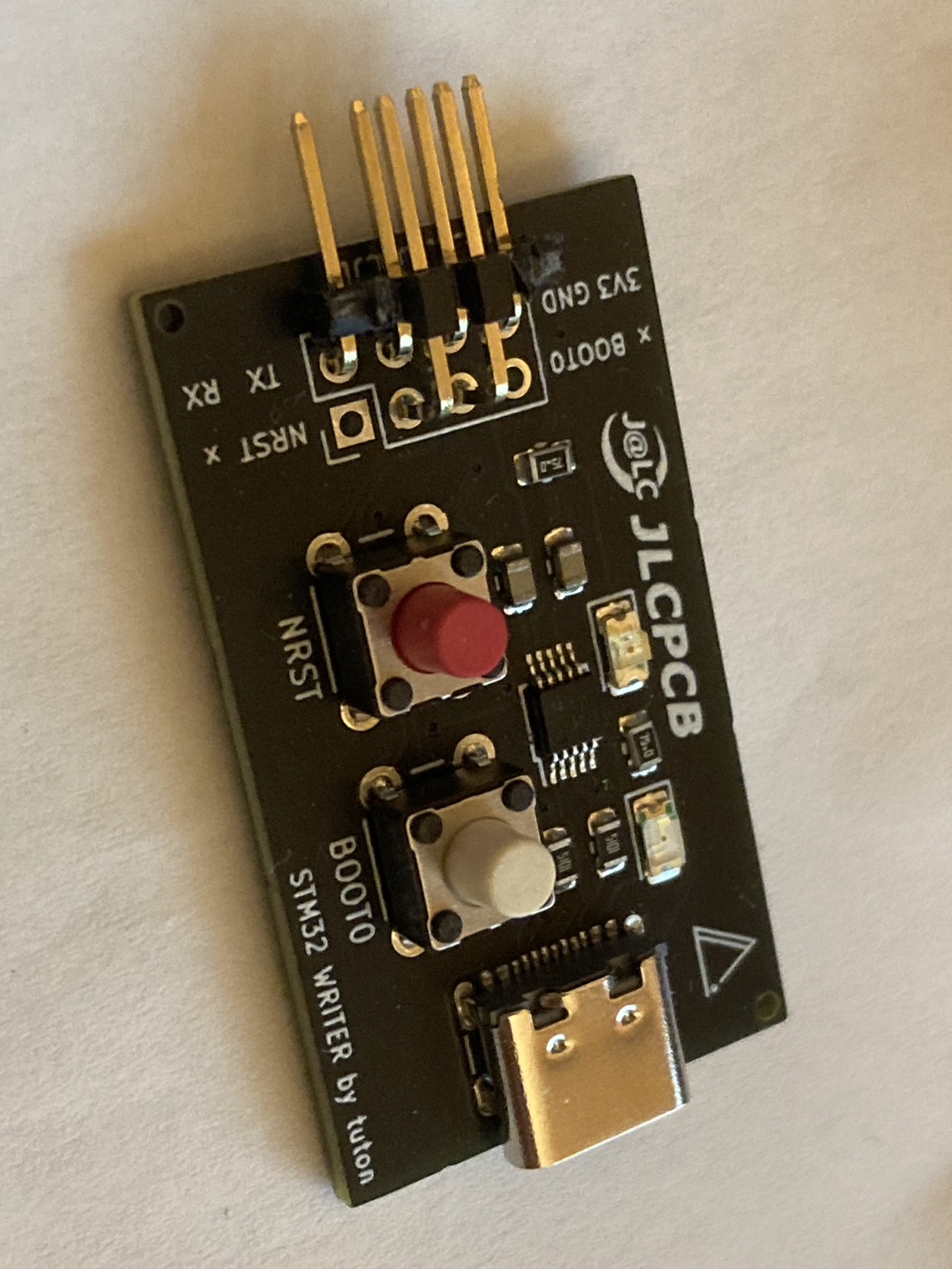 STM32マイコンはST-Link経由やUART書き込みなどいくつかプログラムの書き込み方式あるのですが、今回はUART書き込みを採用することにしました。 UART書き込みをするためにはBOOT0のスイッチやType-Cコネクタなどを実装しなければならないのですが、これは場所を取りますし全ての基板にこれらをのせるのはコスト的にもあまり嬉しくはありません。