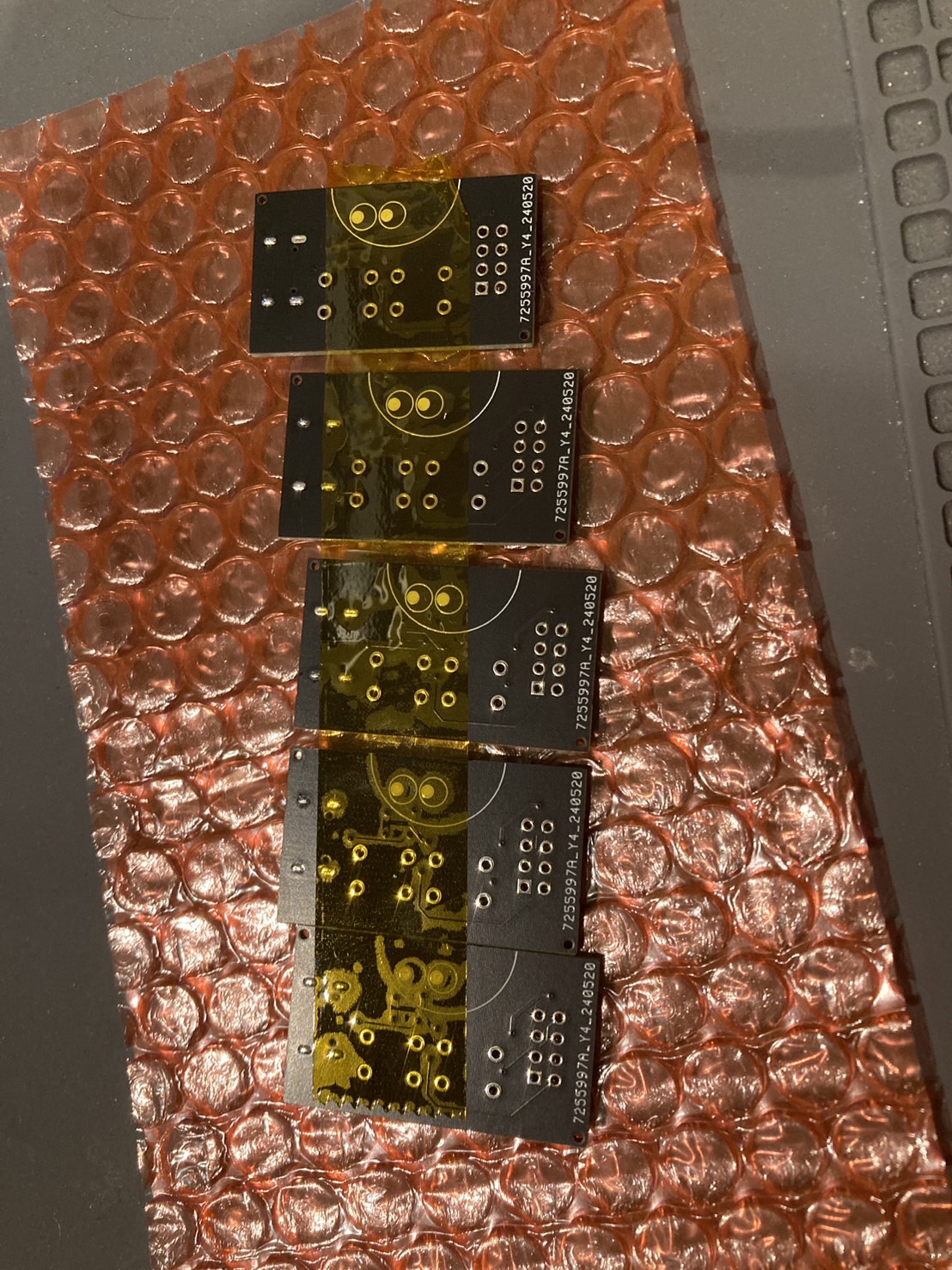 カプトンテープに5枚の基板が貼り付けられて届きました。