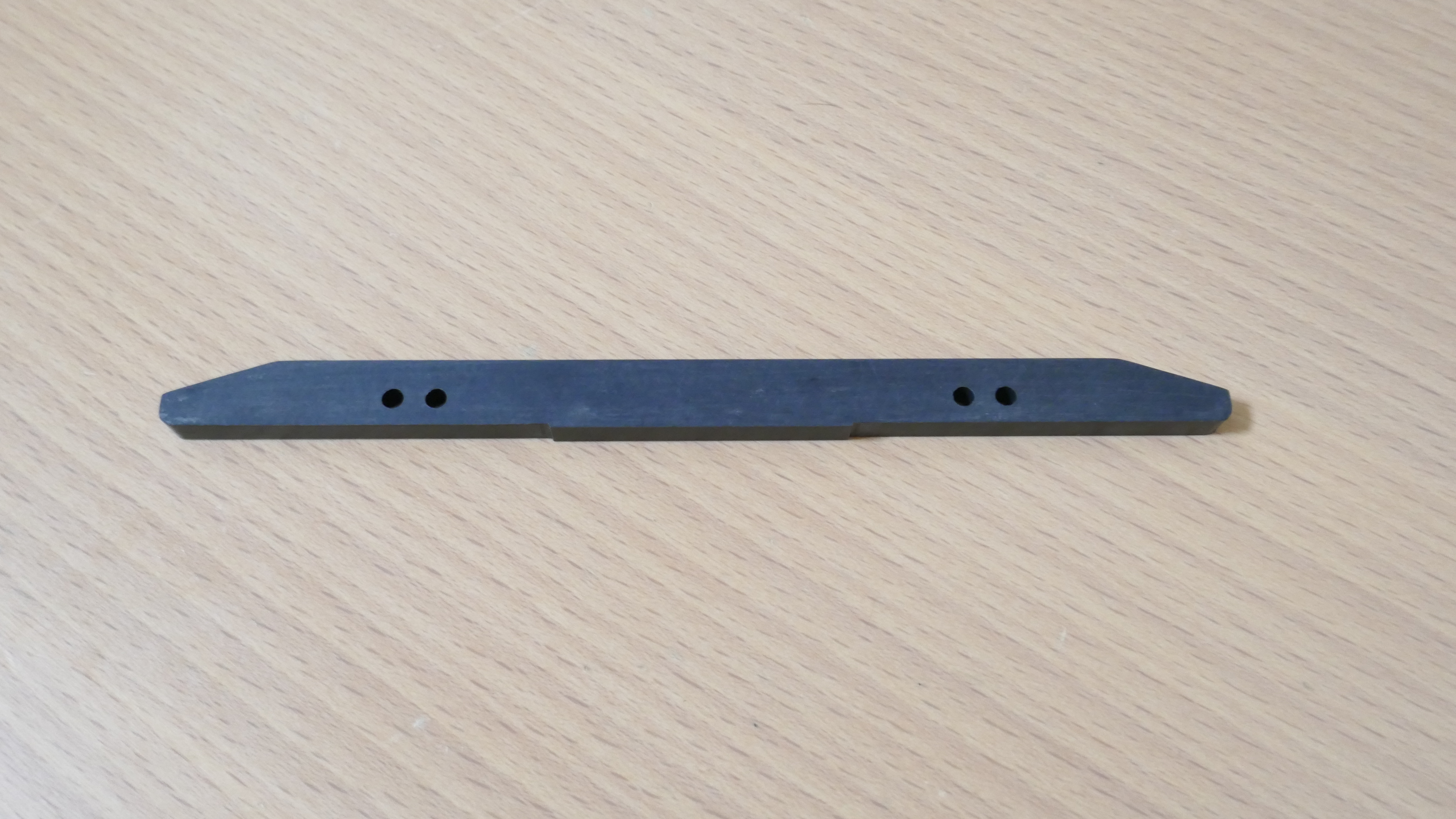 バンパーは機体の色に銀色と白色がかなり多いので、アクセントとして黒い素材で作ってまらいました。 触り心地は、他の光造形の素材に比べて、つるつるしている感じがします。 あと他の素材に比べると弾性があってしなやかな素材です。 なので、バンパー向きの素材ですね。個人的には結構好きな素材です。