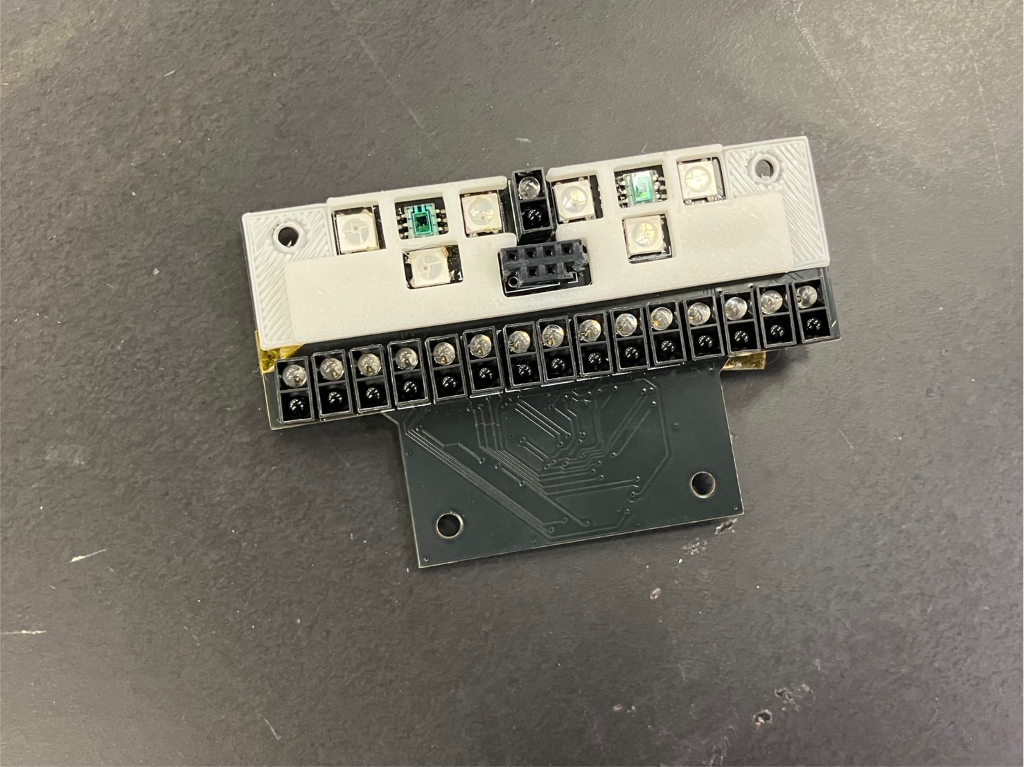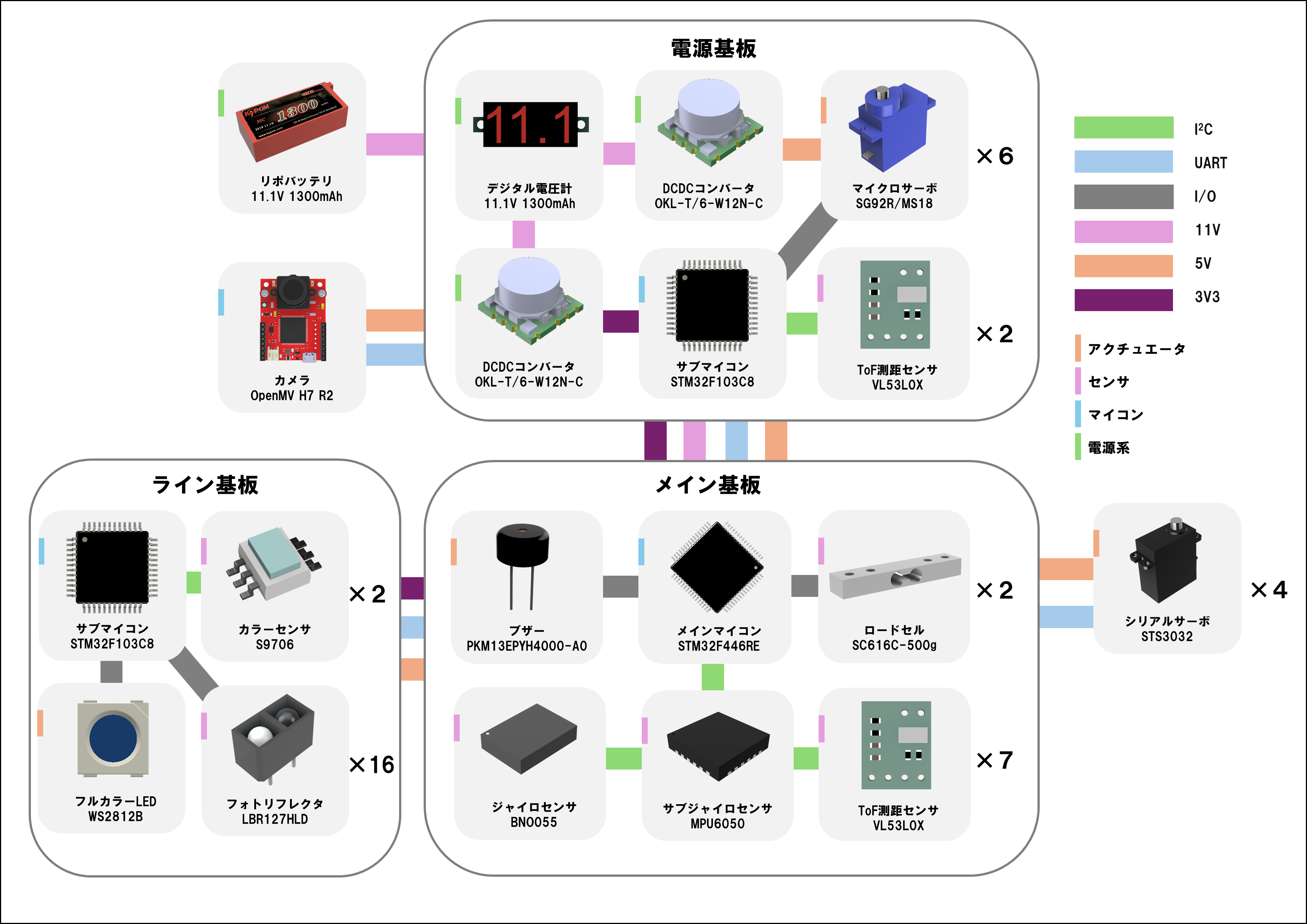 16個のフォトリフレクタと2つのカラーセンサでライントレースを行います。カラーセンサ用のLEDにはNeo Pixelを使用しています。RGBで指定して色を決められるので、私たちは緑と赤の検知精度をあげるために黄色で光らせてます。