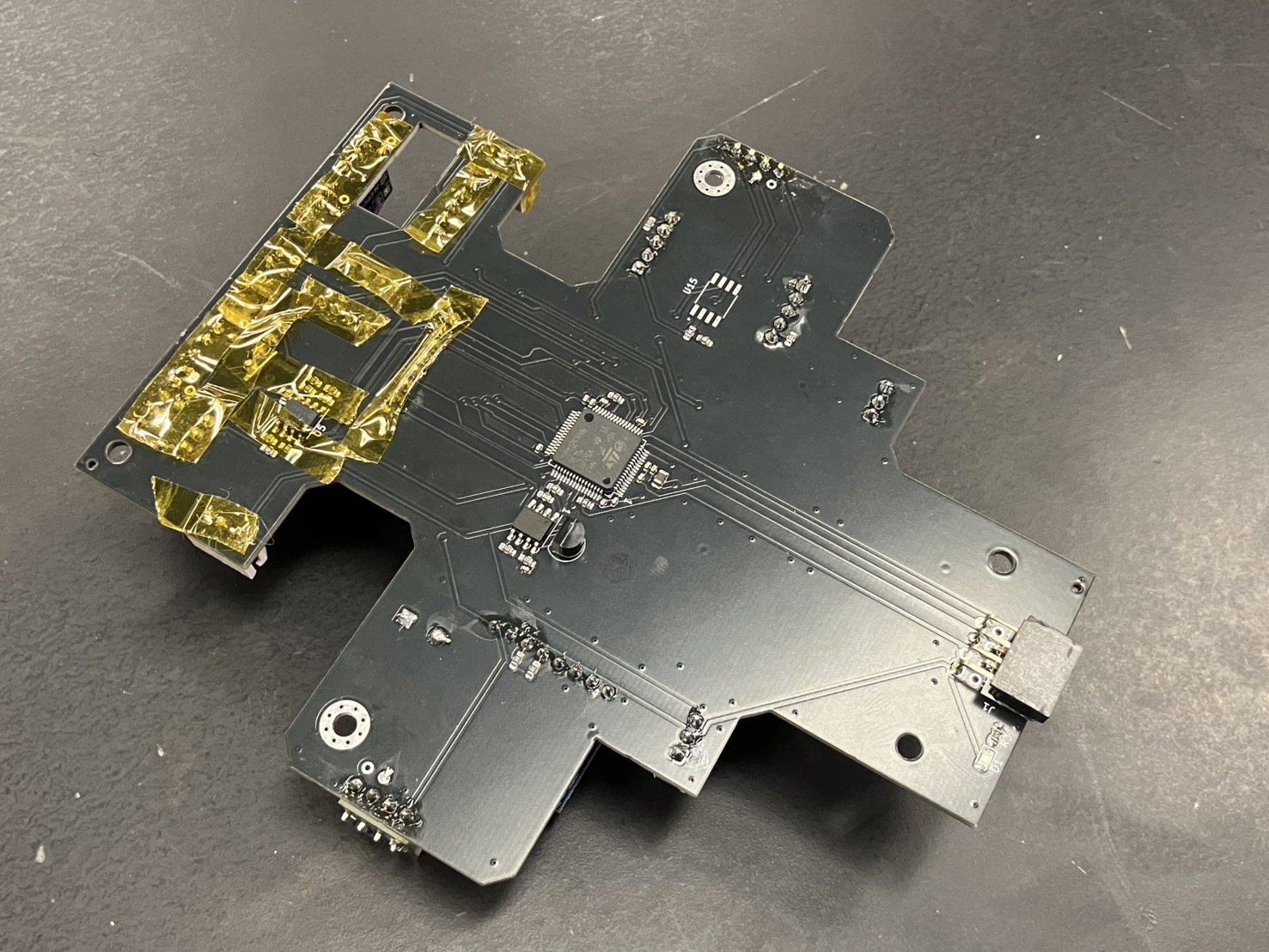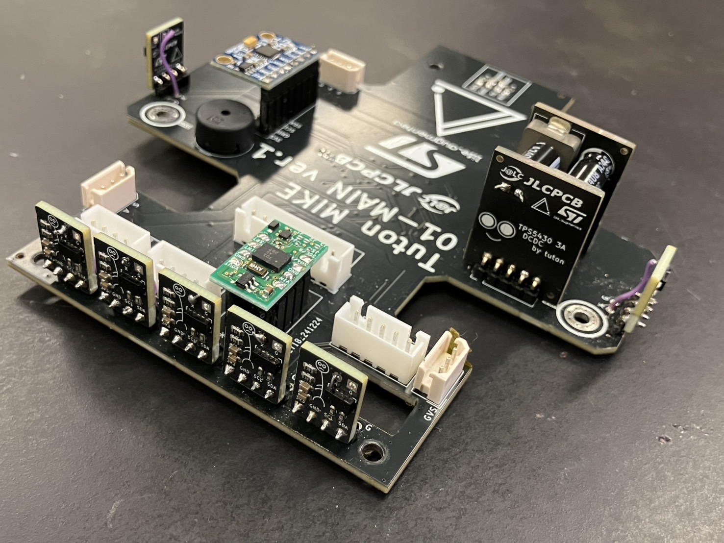 前方と両サイドにはToF距離センサがついています。ToFセンサは通信トラブルのリスクを減らすため基板に直接はんだ付けしています。